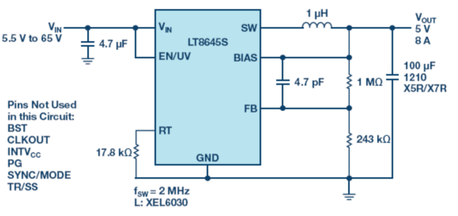 图1.提供5V、8A、2MHz输出的LT8645S原理图